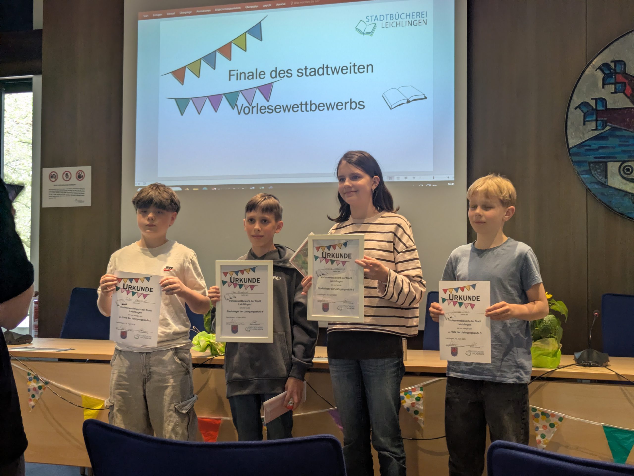 Am Nachmittag des Donnerstags, 16. April 2026, fand im Ratssaal des Rathauses in Leichlingen der Stadtausscheid des Vorlesewettbewerbs für die 5. und 6. Klassen statt.