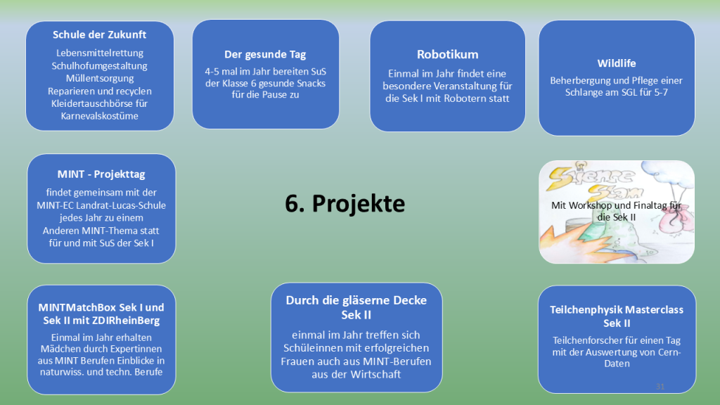 Die Arbeit an den Inhalten der Initiative „Schule der Zukunft“ sind seit diesem Schuljahr fester Bestandteil der Schulentwicklung am SGL. Es gibt eine Arbeitsgruppe „Schule der Zukunft“. Dort arbeiten Lehrerinnen und Lehrer unterschiedlichster Fächer, Schülerinnen und Schüler sowie Elternvertreter mit.